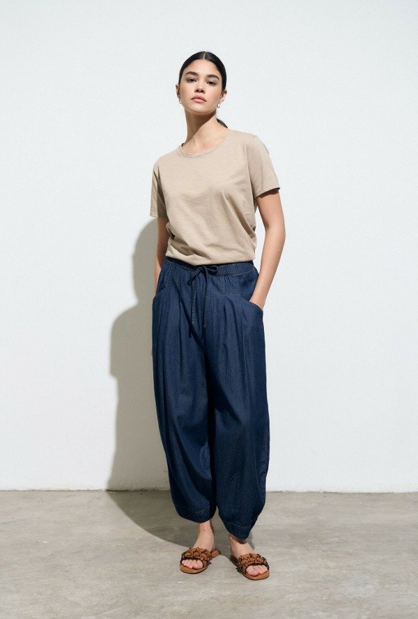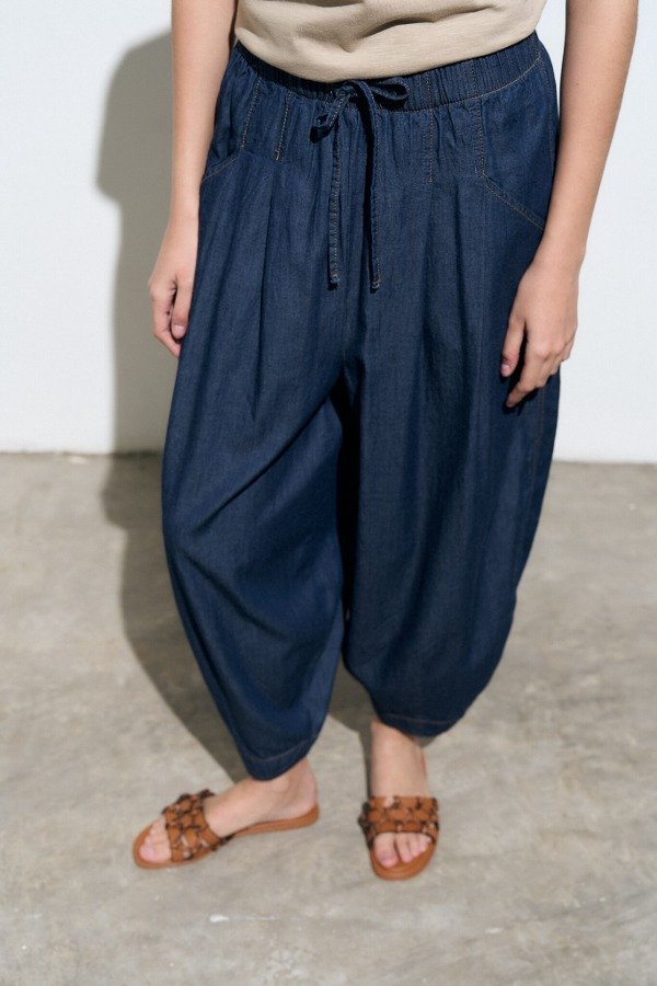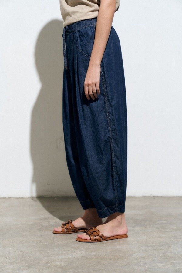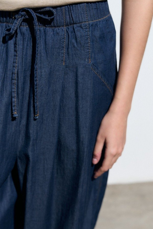 Jean baggy de denim camisero, cintura elastizada con lazos atracados, con pinzas y bolsillo en delantero. AMO