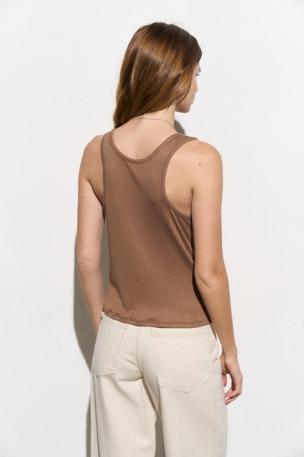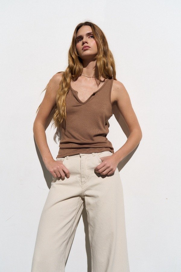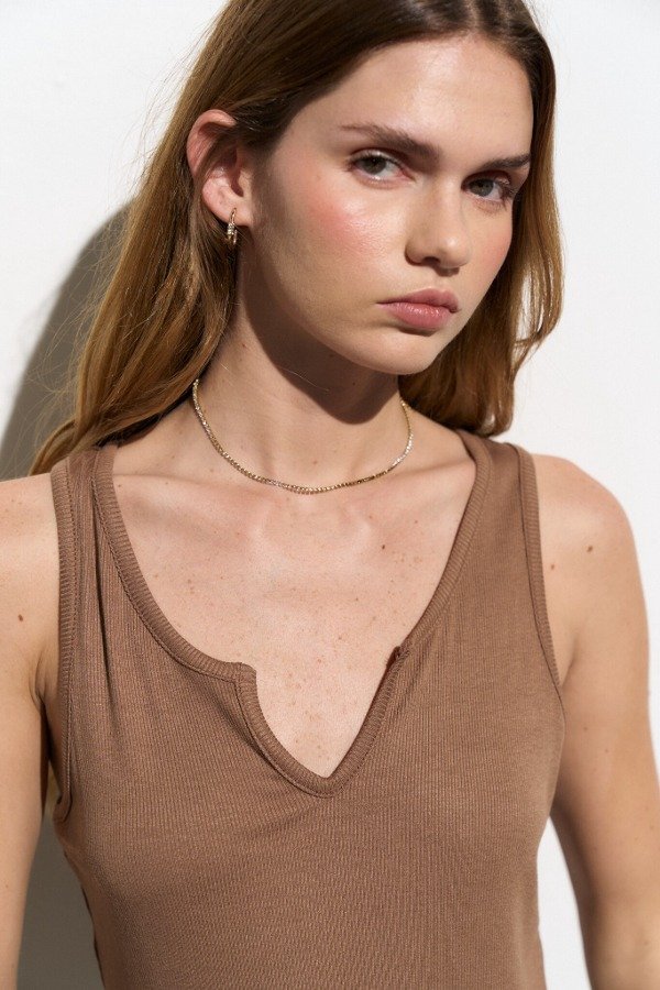 Musculosa de morley viscosa fino con escote redondo y abertura delantera.