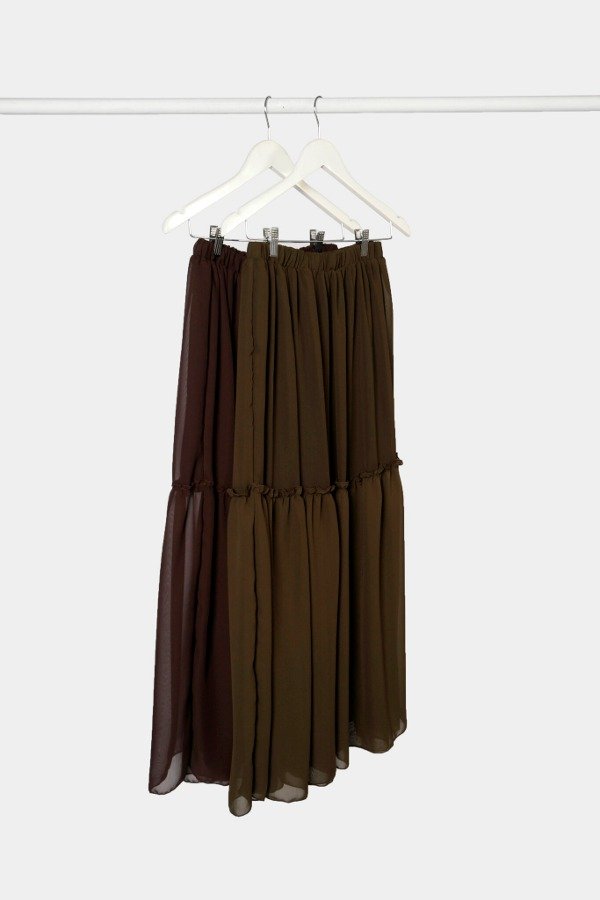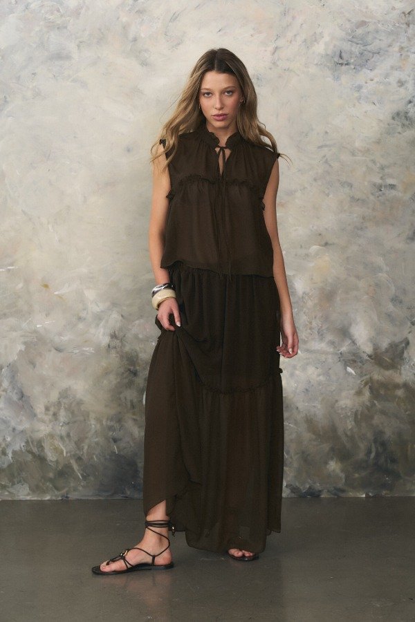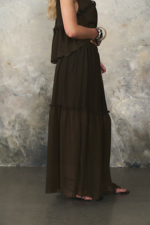 Maxi falda boho chic de gasa con forreria, cintura elastizada y recortes fruncidos con volados terminados con roulette.