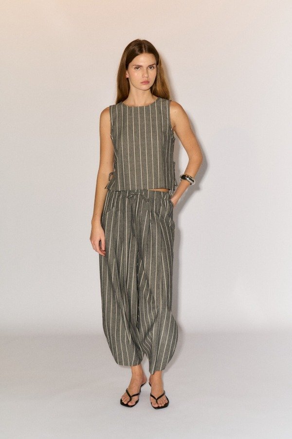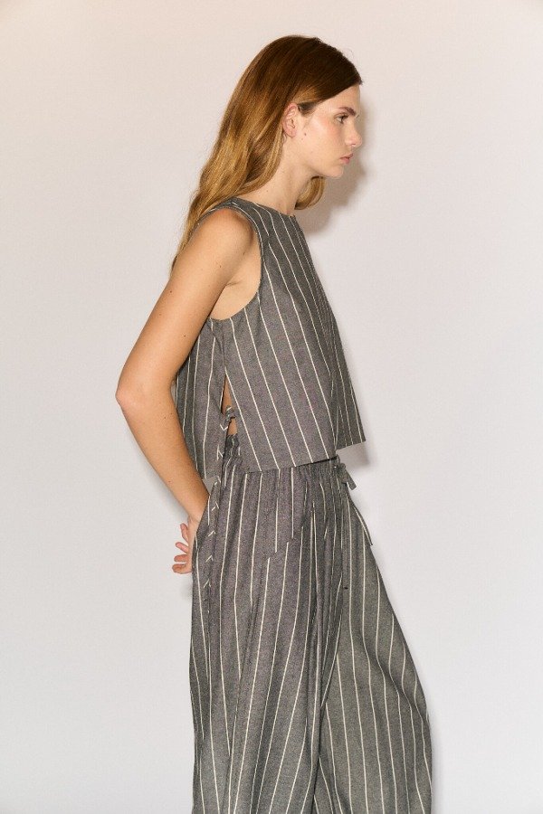 Blusa escote redondo, manga sisa y aberturas con lazos en los laterales. Confeccionados en lino liviano rayado.