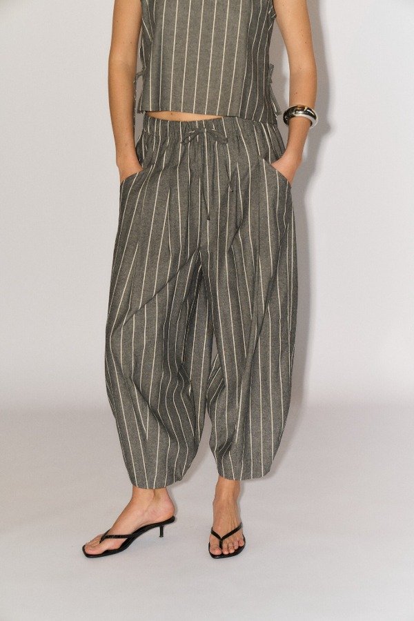 Pantalon sastrero baggy con cintura elastizada con lazo, pinzas y bolsillos delanteros.