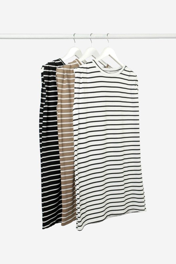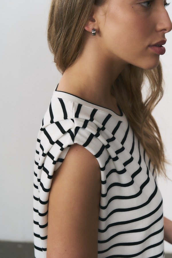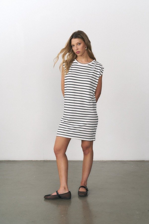 Vestido rayado corto oversized rayado con detalle de tablas en los hombros.
