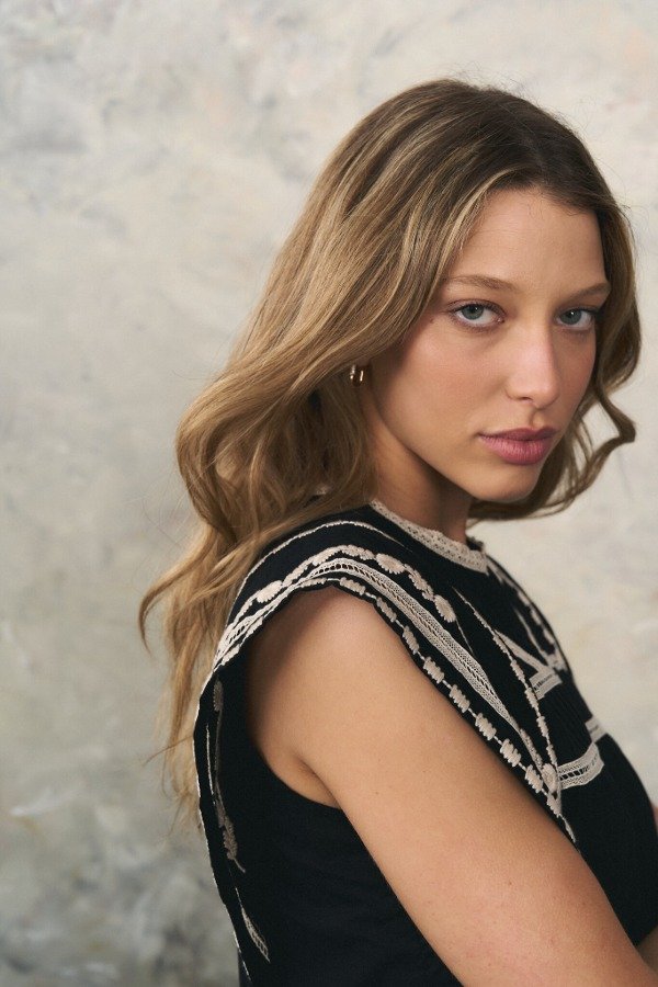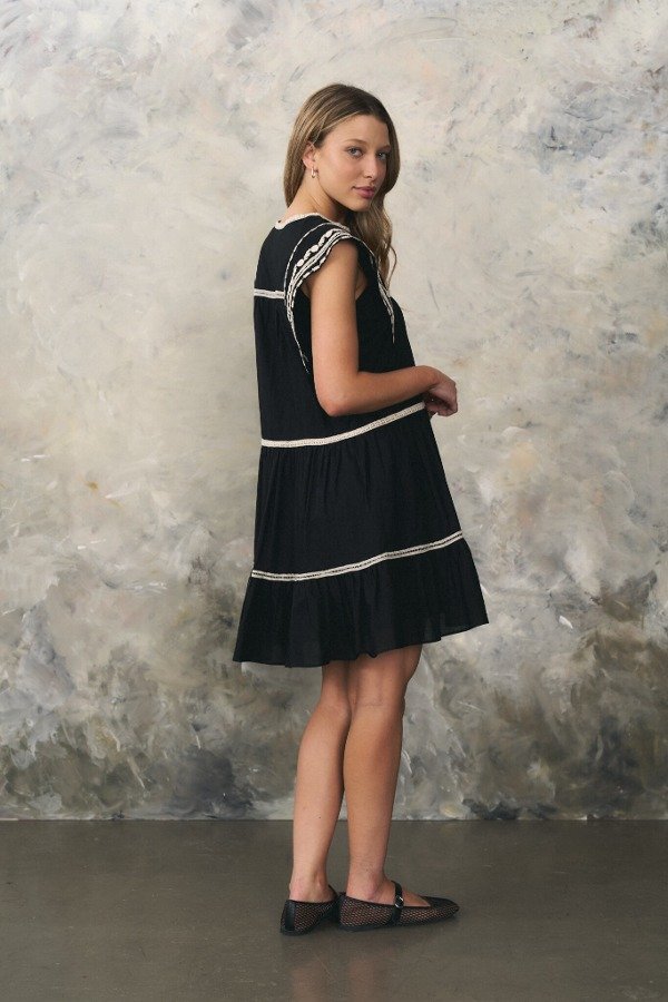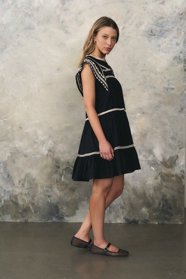 Vestido corto de voile con bordados y puntillas a contratono en recortes.