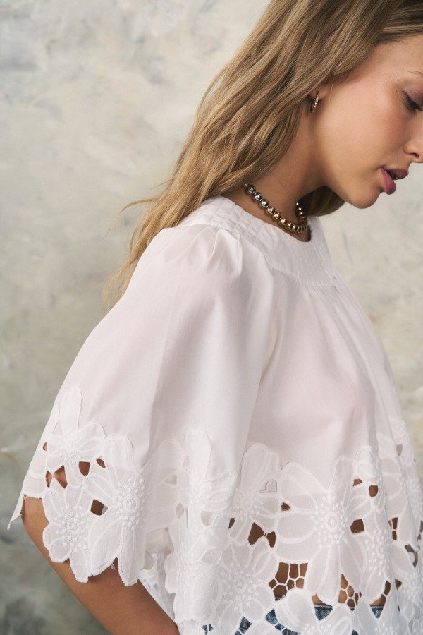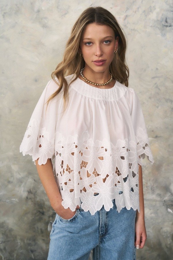 Blusa 3/4 con cuello redondo tableado de embroidery calado en ruedo y mangas.