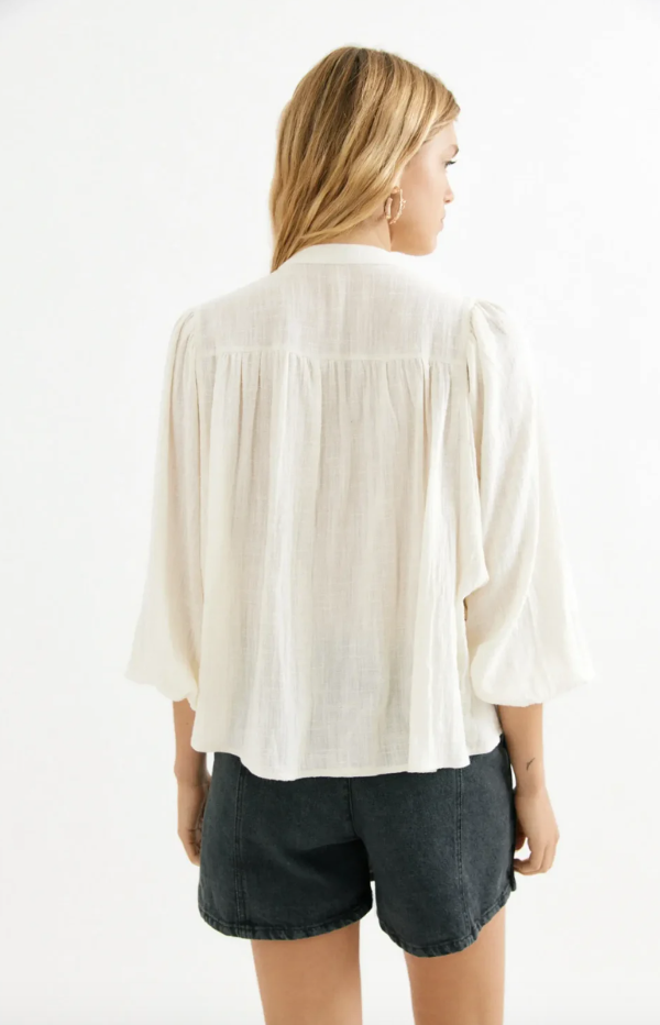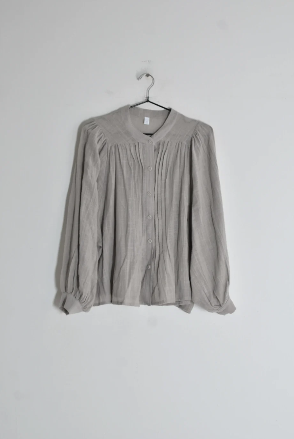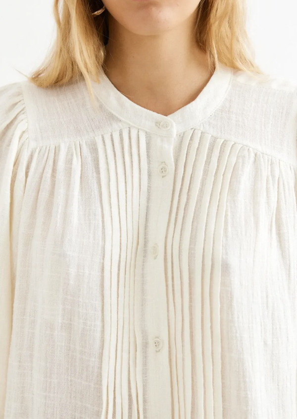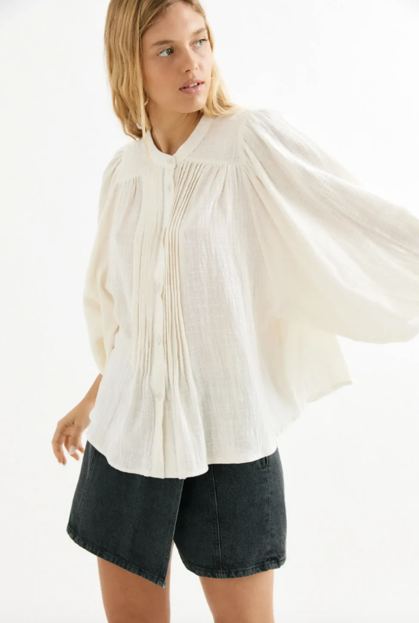 Camisa de gasa de algodón. Es de calce amplio. Tiene tablas en el pecho y cartera con botones a la vista. Manga con volumen.
