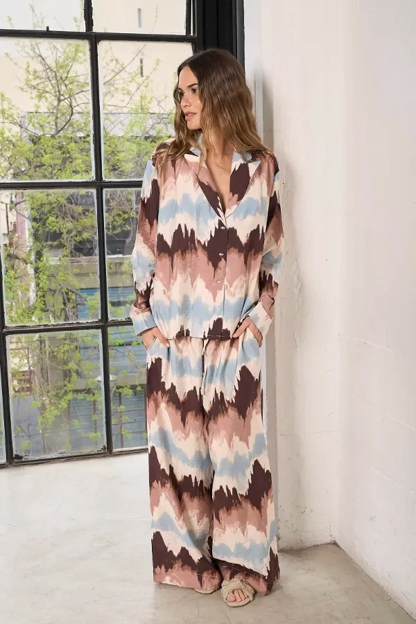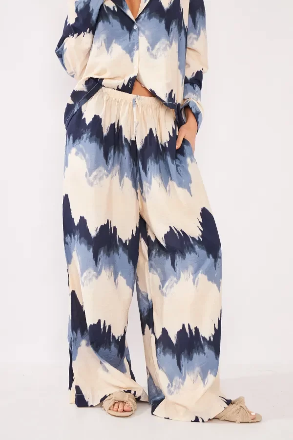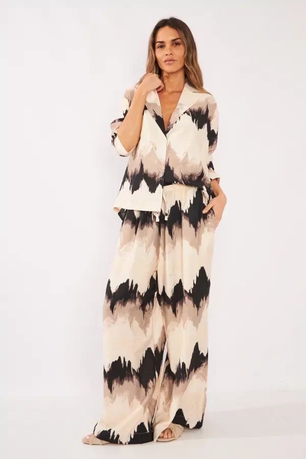 Pantalon amplio confeccionado seda estampada. Modelo amplio con cintura con elastico y cordon a tono para ajustar.